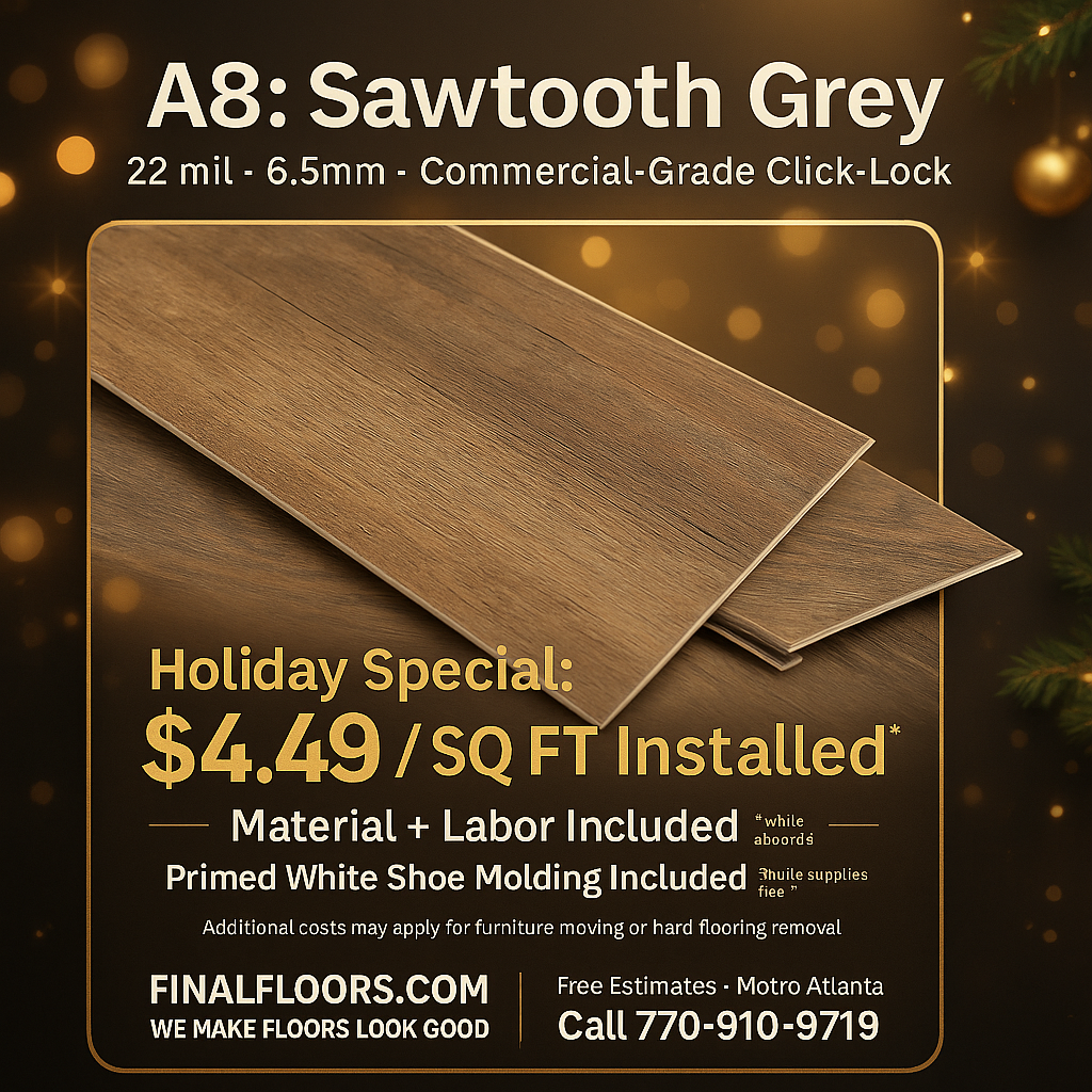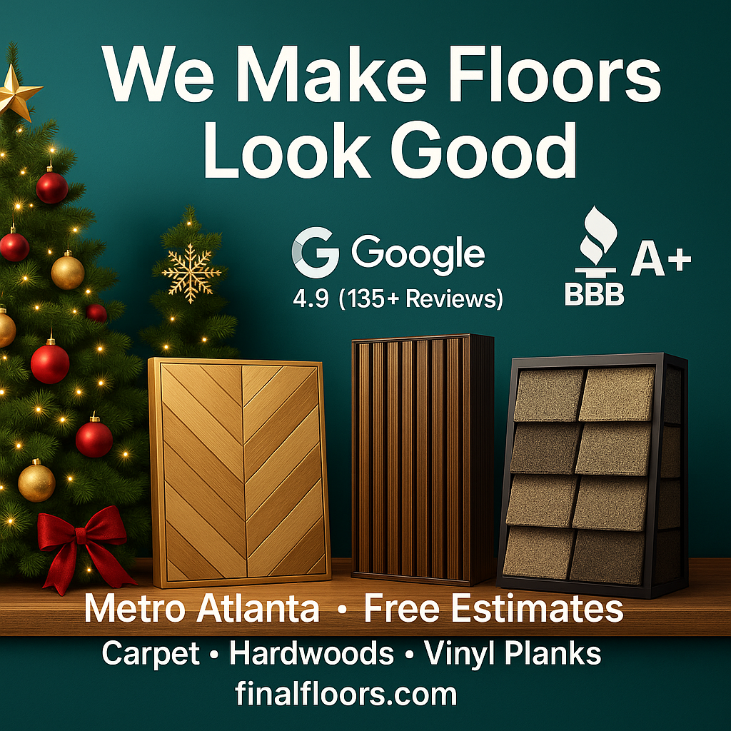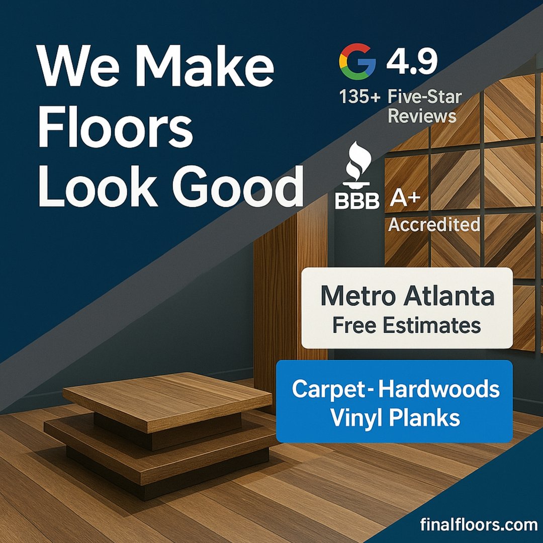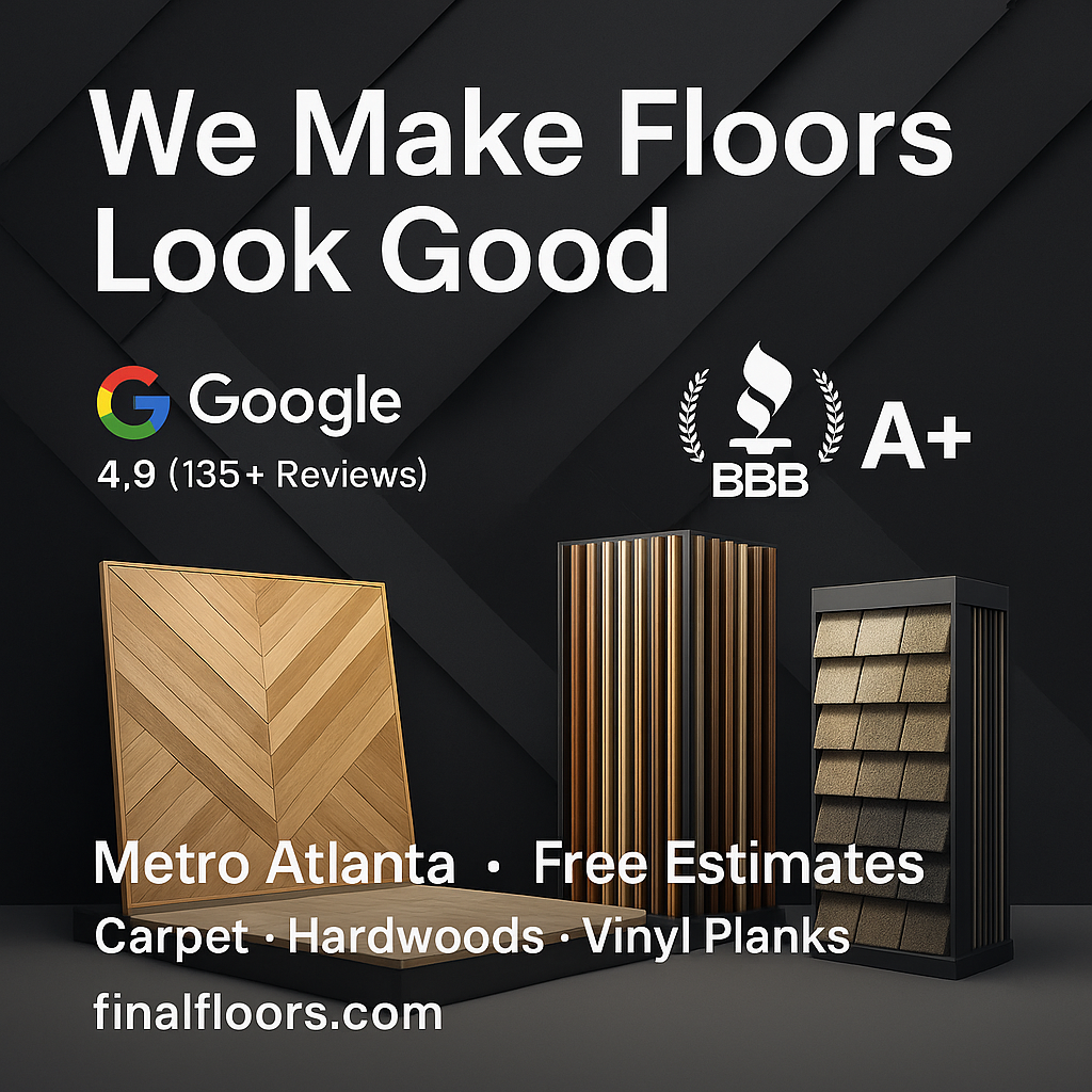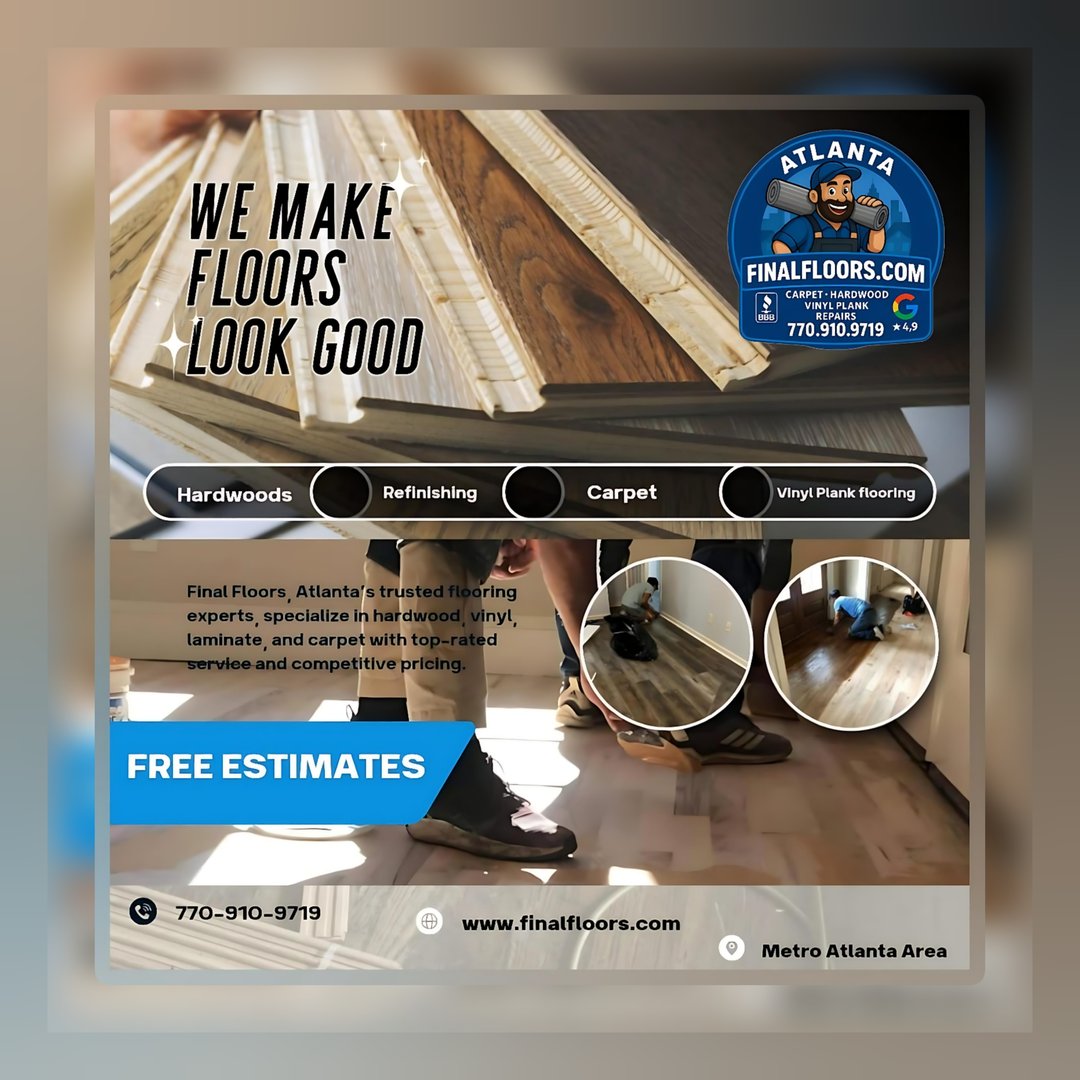 Top-rated Metro Atlanta flooring contractor specializing in hardwood refinishing, luxury vinyl plank, carpet installation, subfloor leveling and water-damage repairs. Final Floors ATL uses licensed in-house crews only and delivers clean, modern, high-quality results with trusted brands like Shaw, Mohawk, COREtec, Bruce and Mannington. A+ BBB accredited with 4.9-star Google reviews, we proudly serve Roswell, Alpharetta, Johns Creek, Sandy Springs, Marietta, Milton, Peachtree Corners, Brookhaven, Buckhead, Cumming and Suwanee. Free estimates.